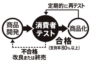 発売後も定期的に消費者テストを実施して80%の支持を得られない商品は不合格となり、改良もしくは終売にします。