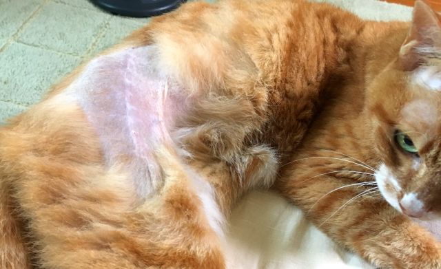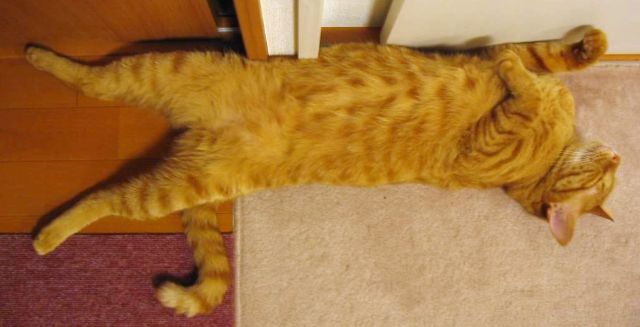寝返りをうつにも難しくなります。在宅時にはちょいちょいと身体の向きを変えたりする必要があります。寝たきりになって床ずれが出来てしまうと、猫は痛いし下僕は消毒などの手間が増えるし良いことは何一つ無いので、大きめのクッションなど柔らかめの寝床にしてあげてください。