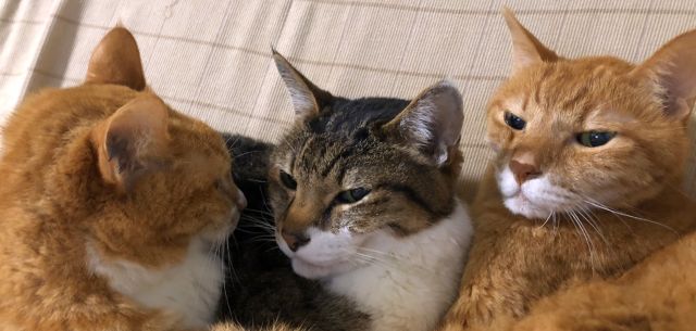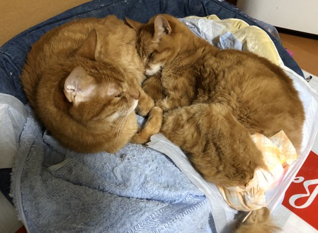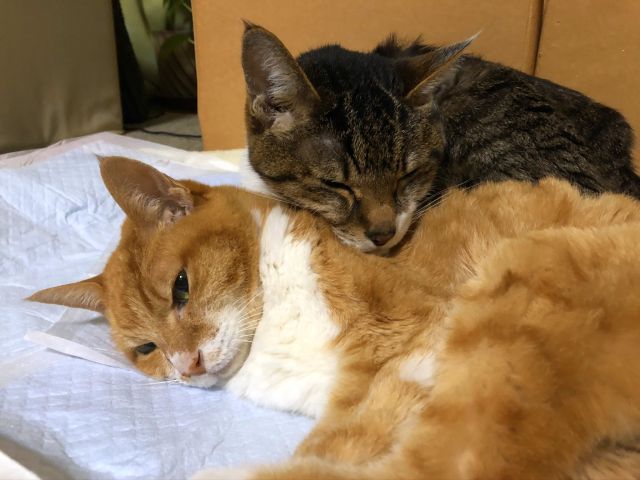 意外にフローリングの床からは冷気が上がってきます。フローリング等の床と猫の寝床の間に断熱効果のあるものを挟んで、猫の寝床が冷えないようにしてあげてください。我が家の場合は、こたつの下に敷く用の断熱シートを畳んで敷いていました。これでバスタオルや毛布などの保温効果がさらに上がります。ウチは寝たきりになってからも兄二人が猫団子で温めてましたけど。