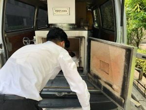 移動火葬車は、見た感じはただのワゴン車(撮影するのを忘れました)なのですが、後ろのドアを開けると火葬炉が豪快に載っています。耐熱炉でしょうから、相当に重いと思います。車体の屋根に煙突が突き出ていますが、歩いててすれ違っても普通の4ナンバーのワゴン車にしか見えないと思います。