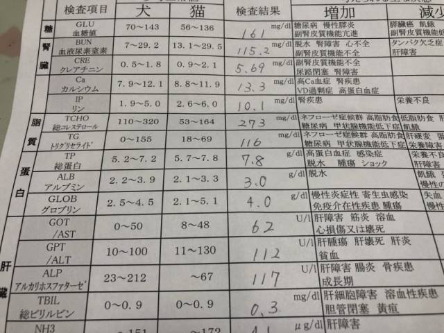 しかしながら、身体全身がぐったりするほどの劇的に悪い数値ではないとの獣医師先生の診たてです(いや、かなり悪いんですけど)。これを超える数値が出てしまったことは過去にもありますし。