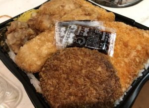 メンチカツにアジフライ、エビフライにから揚げにコロッケなどなどがこれでもかと並んでいます。おかずてんこ盛りってこういうことを言うのね…ぱっと見、色は茶色いのですが、食べ飽きることはありません。この具の下には、一面の海苔、その下には踏み固めたような白飯が大量に敷き詰められています。解体してみると、結構凄いです(笑)。