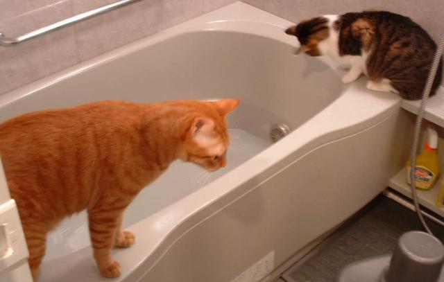 湯張りに興味津々のメンズ猫たち
