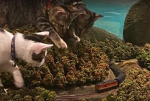 そんなジオラマにやってくる仔猫たち。見るからに若々しく、エネルギッシュに見えます。そんな若猫がやることといえば…「破壊」です。誰しも、怪獣ドラマを見ていると、自分も怪獣のように「模型の街並みを踏みつぶしたい」と思ったことがおありではないかと思うのですが、この若猫たちはそれをいい感じに実現してくれます。この動画のBGMがゴジラですしね。