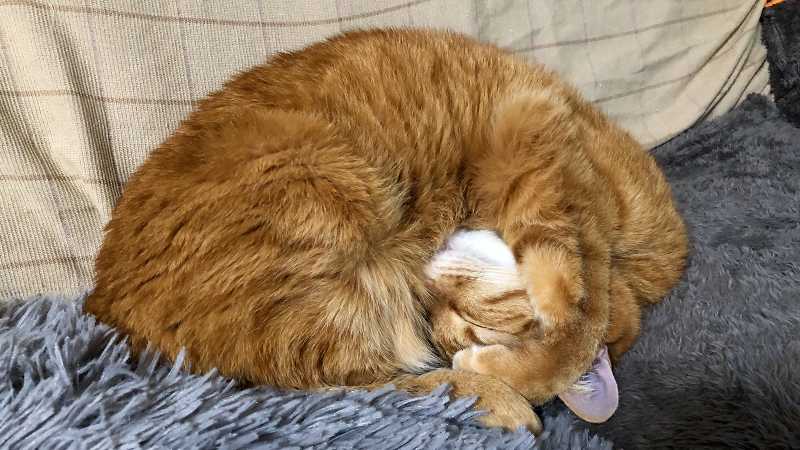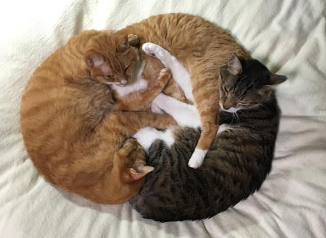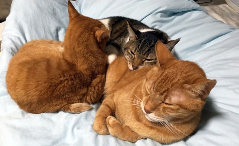 私は腰痛持ちでもあるため、仰向けに寝ると腰への負担が結構あるので横向きで寝たいのです。なのである程度の時間が経つと膝を伸ばして横向きになるのですが、そうすると三々五々、布団を出て行って布団の上で新たな猫団子になるのが常でした。三兄妹にとっては布団よりも猫団子のほうが重要で、朝起きると布団ではなくてソファなどで猫団子になっていることもよくありました。まあ暖かいもんね…