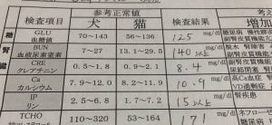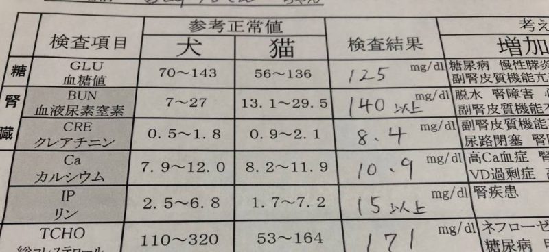 慢性腎臓病になった猫ちゃんは、「なんか調子悪そうだな」と感じた翌日にはぐったりして食欲が全く無い、というようなことが時々起きます。こういう時に病院に担ぎ込んで血液検査をしてもらうと、検査数値がどえらいことになってたりします。