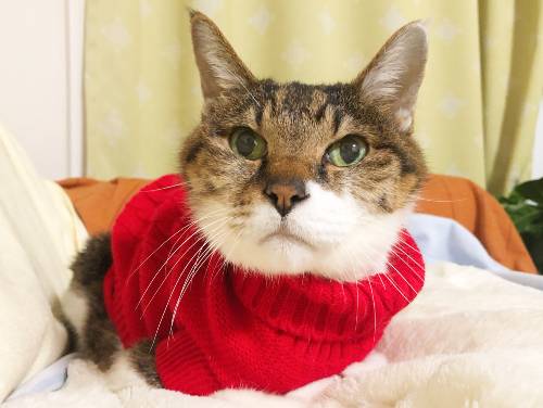 老猫で、しかも兄妹が居なくなって猫団子が出来なくなったことから、保温のために買った冬物の衣類。これは着せた瞬間に、思わず「おおおー」という声が漏れたほど、次男猫によく似合ってたセーターです。猫友さんやフォロワーさんも好意的な反応だったと思います。