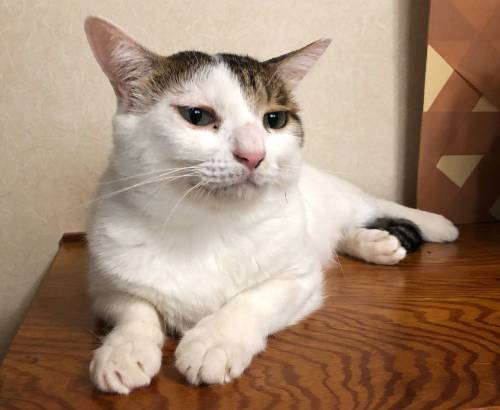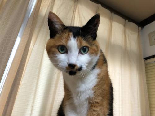 10歳くらいの三毛ちゃん。三毛ちゃんだから気難しいかと思いきや、とっても人懐こい、凄くいい子。「うみゃい!」と言いながらクリスピーキッスを食べてくれました(歓喜)。しかも1回だけでなく何度も「うみゃいうみゃい」と言ってくれました(大歓喜)。身体を撫でても、顔をわしゃわしゃしても嫌がることなく、嬉しそうにしてくれました(昇天)。