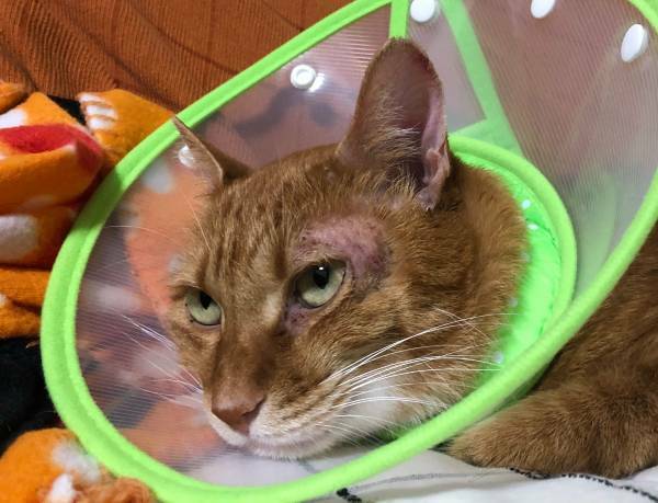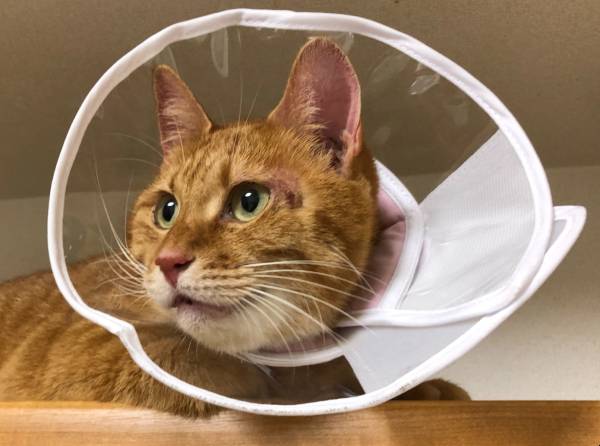 一週間後、ステロイドと抗生剤の効果か、赤みはひいてきて痒がることも減ったのですが、なぜかどんどんハゲが拡大…基本、掻き壊し防止のためにエリザベスカラーを着けてもらっていたのですが、ある日突然、姫ちゃんの顔にミステリーサークルのようなハゲが出現!掻き壊しではなくて脱毛というのは、なかなか衝撃的です。こちらはショックを受けてまじまじと姫ちゃんの顔を見るのですが、本ニャンは「ん?」みたいな顔をしています。そりゃそうです、姫ちゃんは鏡を見たりしないからね…