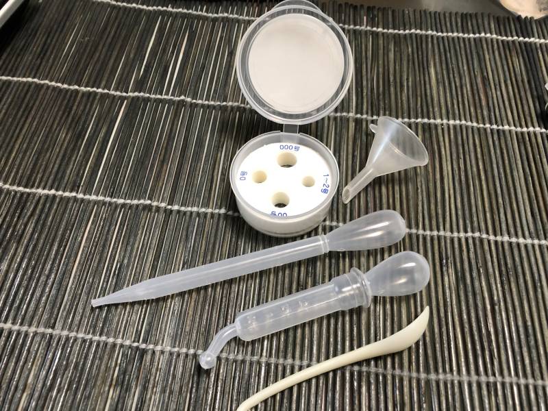 カプセルスタンド・2種類のスポイト・スプーン・ろうと(ミニじょうご)が入っているオールインワンの5点セット。サイズがちょっとわかりにくい写真で申し訳ないですが、いずれもかなり小さいものです。