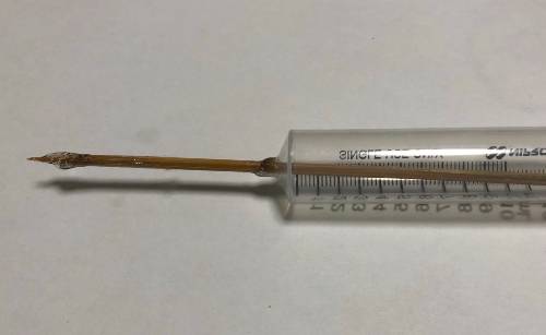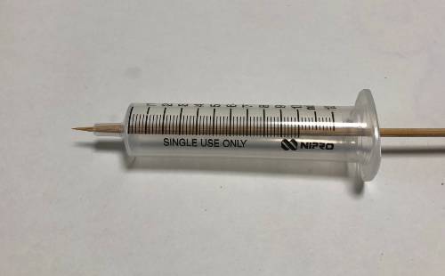 大体、シリンジ先端部の内径は2ミリ。この竹串は太いところが3ミリなので、こんな感じになります。