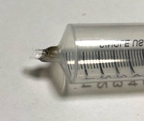 こうした不満を解消するには、詰まりが起こらないようにシリンジの口をちょっと広げてあげればいいわけで…注入口を残しつつ、穴を広げるという作業を実施しました。