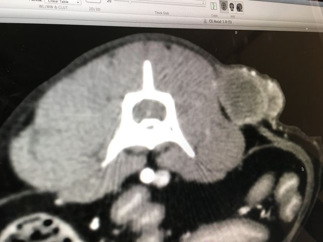 CT画像で見ると予想以上に腫瘤はデカい。皮膚の下にでっかい腫瘍の根っこみたいなのが確認できます