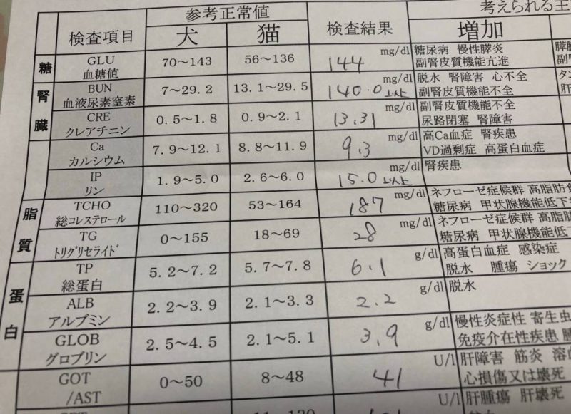 BUNとリンは検出上限を振り切りました…クレアチニンも13.31と過去に見たこともない数値です。もはや腎不全も末期も末期で、尿毒症状態。ゴハンを食べられないのは当然のことで、むしろ、この尿毒症状態の数字と19歳という年齢を考えると、「よく頑張ってる」と掛かりつけ医からは褒められました。メルミルを自分で食べたり、ベランダに出てサンダルをあたためる藤吉郎をしたり、はたまた風呂蓋の上にジャンプするのは奇跡的なのかもしれません。