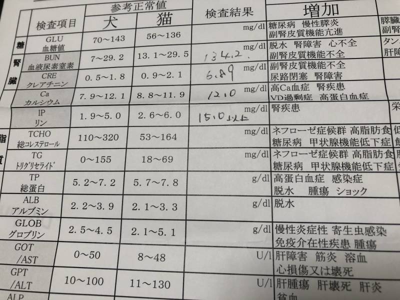 BUNが134.2、クレアチニンが6.89、リンが15以上で病院の検査機器の上限を振り切れるなどと、どエライ数値になっています。この時はさすがに私も獣医さんも慌てたものです。