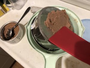 体重3キロの猫の場合、1日にざっくり200Kcal近いエネルギーが必要となりますが、これは標準的に元気な猫の場合であり、寝たきりの場合の必要カロリーはもっと少なくてもいいはず。「何が何でも200Kcalを摂取させないと」と鬼の形相で強制給餌しても、身体が受け付ずに吐いてしまっては元も子もないので、お互いに無理のない範囲で、ちょこちょこと与えていました。高カロリーなウェットフード(ウェットフードを裏ごしすると、シリンジが引っかかることが激減するので、とてもスムーズ)をシリンジで強制給餌していました。