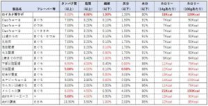 ざっと見て、タンパク質は低くコントロールされているのと同時に、脂質の多さとカロリーの高さが目を引きます。