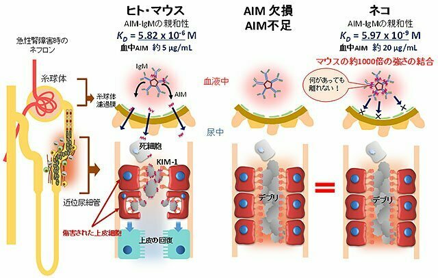 人間にも猫にも血液のなかにAIMというタンパク質はあるのですが、人間のAIMは腎臓の尿に濾過するところがゴミで詰まるとそのゴミ掃除に出動していくのに対し、何故か猫のAIMは出動しないのだそうで…何故じゃ!