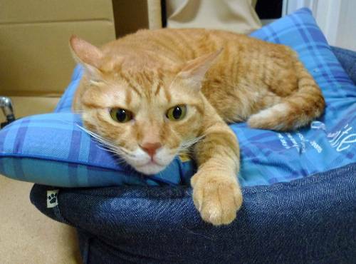 何やら物思いにふけっているようなこちらの長男猫は8歳。年齢とともに少し筋力が衰えていて、巨体で本棚に飛び上がったりするのがツラくなっていた時期ですが、よく介助して本棚の上に乗せてやってたっけ。本棚の上で長女猫が寝ていることが多く、どうやらそこへ行きたかったみたいです。二人でよく頬を寄せ合って寝ていました。