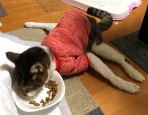 今はまだ立っていても前後左右に揺れているため、ちゅ~るを食べる時も自力での姿勢維持が難しいらしく時間はかかりますが、それでも1本を完食できるくらいには立っています。ただ、右脚は少しまだ不自由みたいで、そのためか、歩いている時は「とてちん、とてちん」という足音がします。