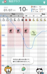 このグラフでは、昨日の夕方から気圧が急降下する予想となっていました。この●~*の警戒マークがでるタイミングは、高齢の次男猫にとっては結構ツライ状態のようなのです。