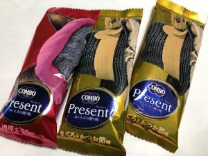 twitterのフォロワーさんたちからも、非常に食いつきが良いという反応が複数ありまして、常備しているという方もいらっしゃいました。また、他のフォロワーさんからいただいた情報では、オヤツ版ではなく、フード版のコンボ・プレゼントもあるとか。ちょっと調べてみるとなかなか興味深いスペックだったので、早々に買い求めました。