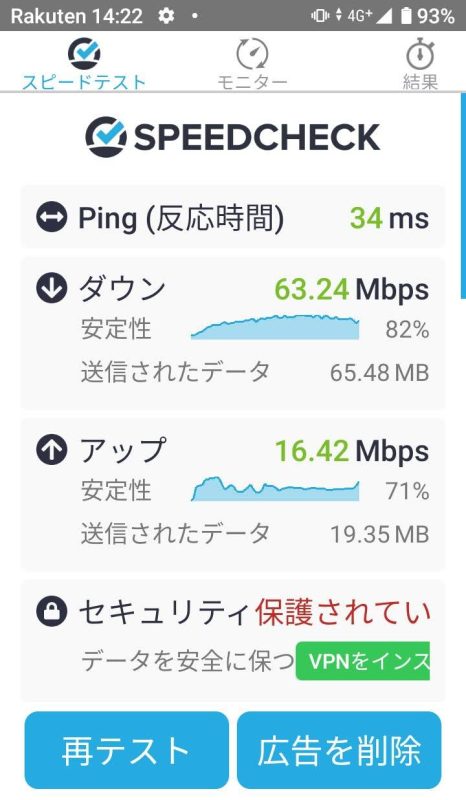 下りで63.24Mbps、上りで16.42Mbpsが出ました。これだけ出れば、かなり速いんじゃないですかね…鉄筋コンクリートの室内で、電波の入りが悪いんじゃないかと危惧していましたが、正直、予想以上に速いです。