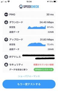 下り24.4Mbps、上り31.83Mbpsと、まあまあ悪くない速度です。我が家の中では、iPhone8をLTEで繋ぐより、楽天モバイルのRakuten handをテザリングで繋いだ方が速いということになりました。