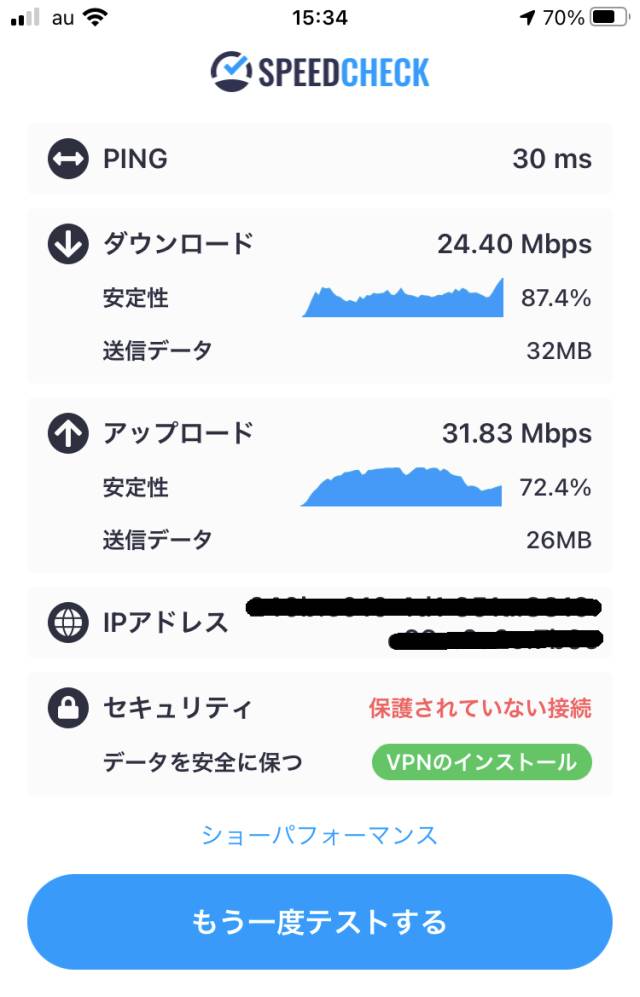 しかし、今んところは、私の場合は長年契約してきたauに比べて、断然、回線スピードが速いことが判明しました。